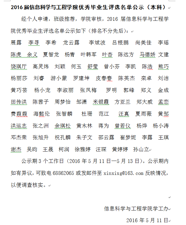 2016屆信息科學與工程學院優(yōu)秀畢業(yè)生評選名單公示(本科)