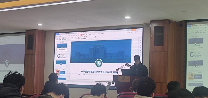 圖3.劉俊做題為“一種基于強化學習的自適應多目標優(yōu)化算法的路徑規(guī)劃方法”的報告